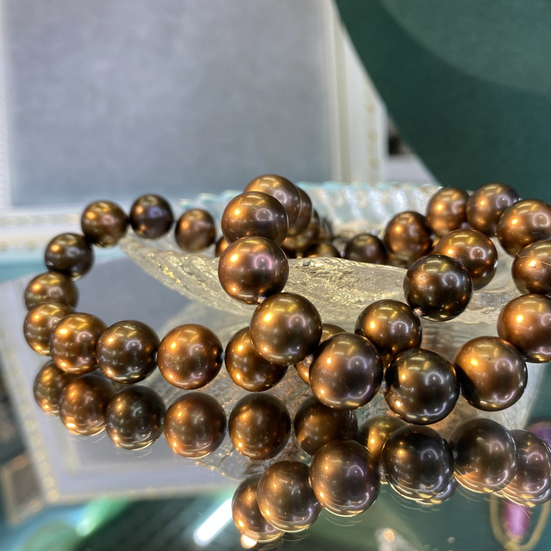 ไข่มุกสีช็อกโกแลต หรือสีน้ำตาล เป็นไข่มุกที่คนส่วนใหญ่ตามหา และได้รับความนิยมอย่างมาก โดยเฉพาะในโลกของแฟชั่น เพราะใส่แล้วดูหรูหราและน่าค้นหา มักจะหาไข่มุกสีเหล่านี้ ได้จากไข่มุกตาฮิติ ตามธรรมชาติ หรือ ไข่มุกหอยน้ำจืด ที่ถูกนำไปผ่านกระบวนการขั้นตอน เพื่อย้อมสี